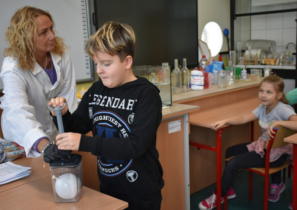 Uczniowie klasy 2a w ramach realizacji innowacji pedagogicznej „Ciekawość…pierwszy stopień do wiedzy – MŁODZI ODKRYWCY”, po raz kolejny uczestniczyli w zajęciach z Panią Ewą Chilońską, która tym razem zdradziła im tajniki działania półkul magdeburskich, pokazała magiczną żarówkę i jej delfina, wykonała eksperyment z bombą wodną i jajkiem piłką oraz zamknęła ogień w butelce. Na zakończenie zajęć zainteresowała uczniów płonącą dłonią i wężami z płyty CD. Eksperymenty zrobiły na młodych odkrywcach duże wrażenie i jak zawsze, z ogromną niecierpliwością czekają na kolejne zajęcia.